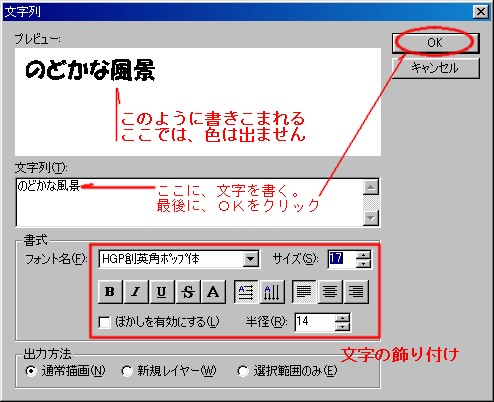 文字を書き、OKをクリック