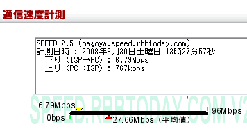 ◆管理人のネツト速度を計測してみました。 (WinoowsXP.SP3 ADSL8Mbps 4ポートハブ) ![]() ・以上の結果がでました。 ・契約速度…8Mbps 計測値…6.79Mbps ・効率 85% ………… 6.79÷8×100=84.875 (効率 100%は、殆ど出ないと思います) ◆効率に対する評価(独断と偏見です) ・41%以上………………… 優秀 ・31%〜40% ……………… 良好 ・20%〜30% ……………… 実用範囲 ・19%以下………………… 調査の必要あり |